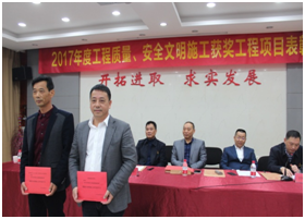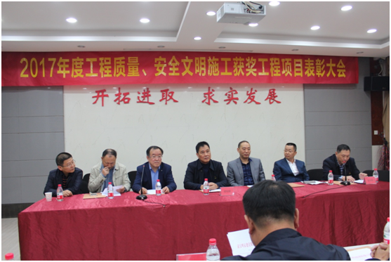 集團(tuán)公司副總經(jīng)理胡萍同志宣講了《關(guān)于表彰2017年度獲獎工程項目的決定》決定對集團(tuán)公司2017年度榮獲的7個工程質(zhì)量及5個安全文明施工工程項目進(jìn)行了表彰,并由武漢市建筑業(yè)協(xié)會副會長兼秘書長李淼磊、中杰投資公司董事長池建國、勞動街辦事處黃主任及鳴辰集團(tuán)公司董事長王春才為保利時代K18地塊A、B棟及地下室工程、高雄壹號工程、幸福灣二期工程、保利清能西海岸北區(qū)五期工程、祥運鞋業(yè)生產(chǎn)車間工程等受表彰的項目進(jìn)行了頒獎。