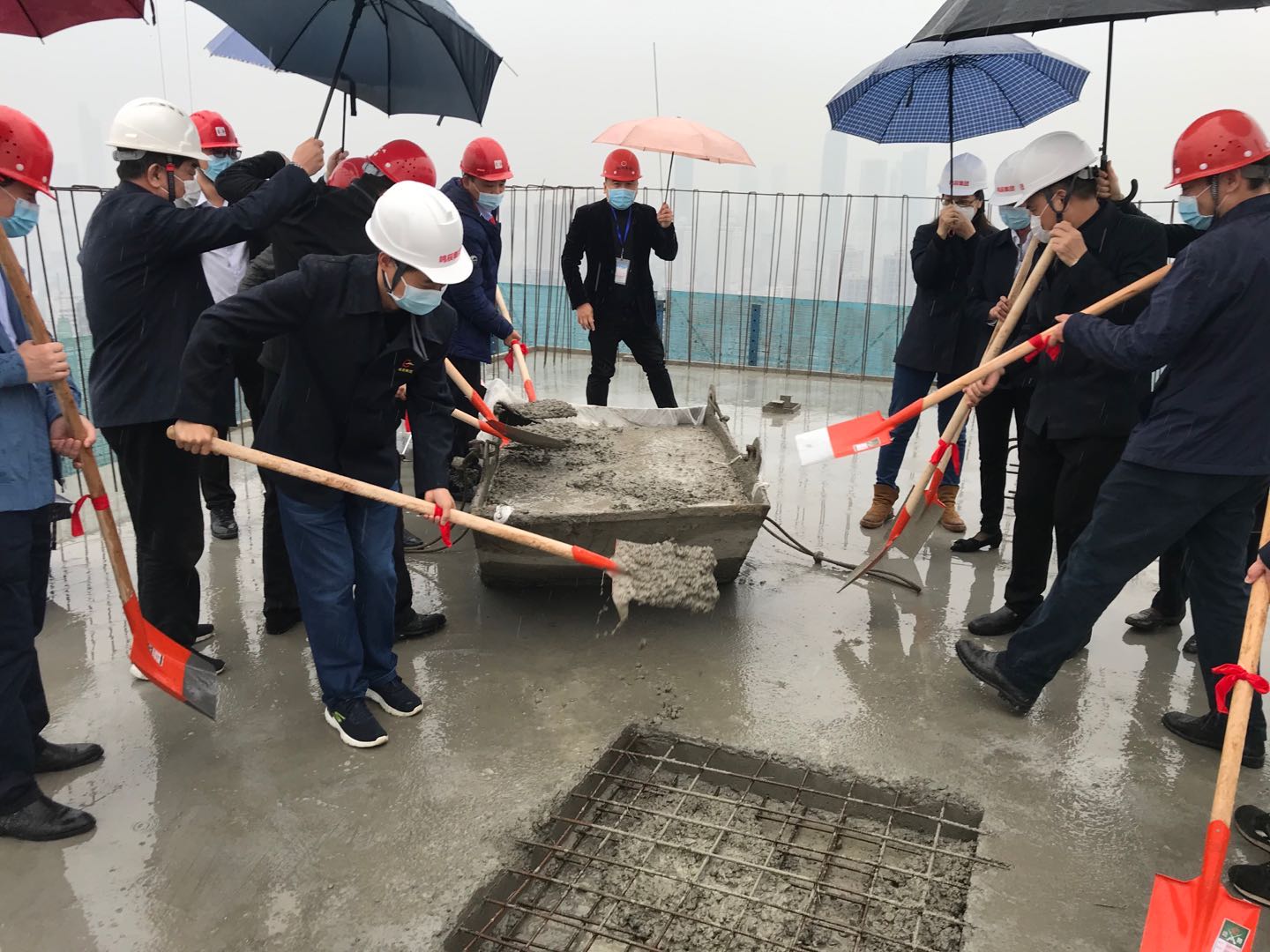 中海集團(tuán)公司李總和江總與武漢鳴辰建設(shè)集團(tuán)有限公司黨委書記王春才同志、總經(jīng)理張惠忠同志共同為鳴辰集團(tuán)中海澳門佳園工地澆筑最后一方混凝土,標(biāo)志著該項(xiàng)目順利封頂。